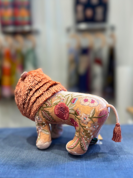 Adorned with intricate hand embroidery on sumptuous silk velvet, this exquisite lion features soft, ethereal Pink Quartz hues, radiating grace and sophistication. The detailed embroidery highlights its regal form, making it a captivating decorative piece for refined interiors.