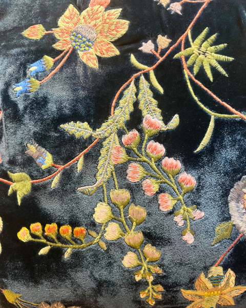 Discover the artistry of Anke Drechsel with the MADAME BOVARY: Indigo Silk & Velvet Cushion. Handmade in Germany, this exquisite cushion pairs a deep indigo velvet base with intricate floral embroidery in soft pastel hues of green, pink, blue, and aqua. The interplay of rich velvet and delicate embroidery creates a timeless harmony of elegance and charm.