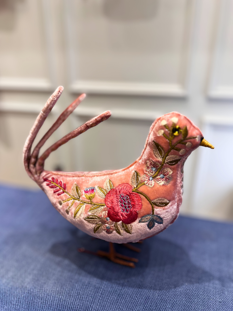 This elegant dove features a soft pink velvet body that exudes warmth and sophistication. The design is enhanced by intricate embroidered embellishments in shades of pink and green, adding a delicate touch of color and texture.